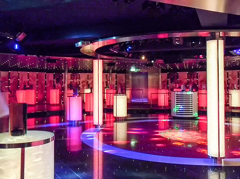 Die Anytime Bar am Heck auf Deck 12 ist die Disco an Bord. Man erreicht sie entweder über das Aussendeck oder innen durch einen wirklich toll gestalteten Gang. Er sieht aus, als würde man durch eine Röhre gehen. Ein Foto davon gibt es hier im Album. Die Anytime Bar öffnete während unserer Nordeuropa-Kreuzfahrt täglich um 22:00 Uhr. An jedem Tag gab es eine andere Mottoparty: Welcome-Disco, Glamorous Nights, Black & White Party, Farewell-Disco mit dem Clubteam, 70's Party, Beach Party, Neon - die 90's Party. Die direkt angrenzende Ocean Bar öffnete am manchen Tagen bereits um 10:00 Uhr, an den anderen Tagen spätestens um 14:00 Uhr.