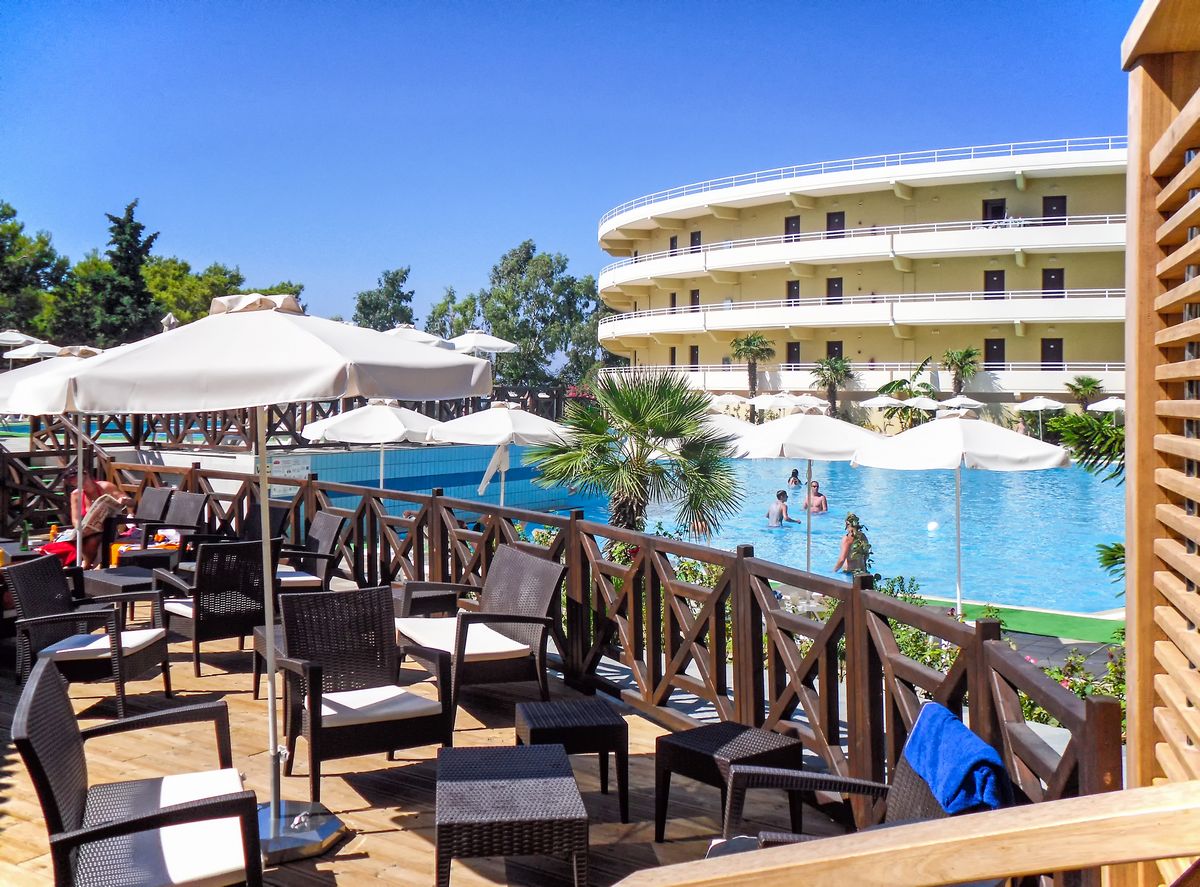 Den Swimmingpool findet man direkt am Haupteingang des Hotels. Er ist schön gestaltet, sauber und ausreichend groß. Lediglich der Liegebereich rings um den Pool sowie die Anzahl der Sonnenliegen sind für die vielen Gäste in der Hauptsaison zu knapp bemessen. Leider werden auch hier von vielen Gästen schon sehr zeitig am Morgen die Sonnenliegen mit Handtüchern und sonstigen Gegenständen reserviert, um dann erst viel später am Tag genutzt zu werden. Die Nähe des Pools zur viel befahrenen Hauptstraße und dem Hotelparkplatz ist nicht ideal. Die Hotelzimmer im direkt an den Pool angrenzenden Hauptgebäude sind so angeordnet, dass sich die Balkons nur auf der dem Pool abgewandten Seite befinden. So werden Beschwerden wegen Lärmbelästigungen vermieden. Wer es etwas ruhiger haben möchte und auf eine schönere Umgebung wert legt, sollte sich die Poolanlagen des auf demselben Gelände zu findenden Hotels Kalithea Horizon Royal anschauen und eventuell lieber ein Zimmer in diesem 4-Sterne-All-Inclusive-Hotel buchen.