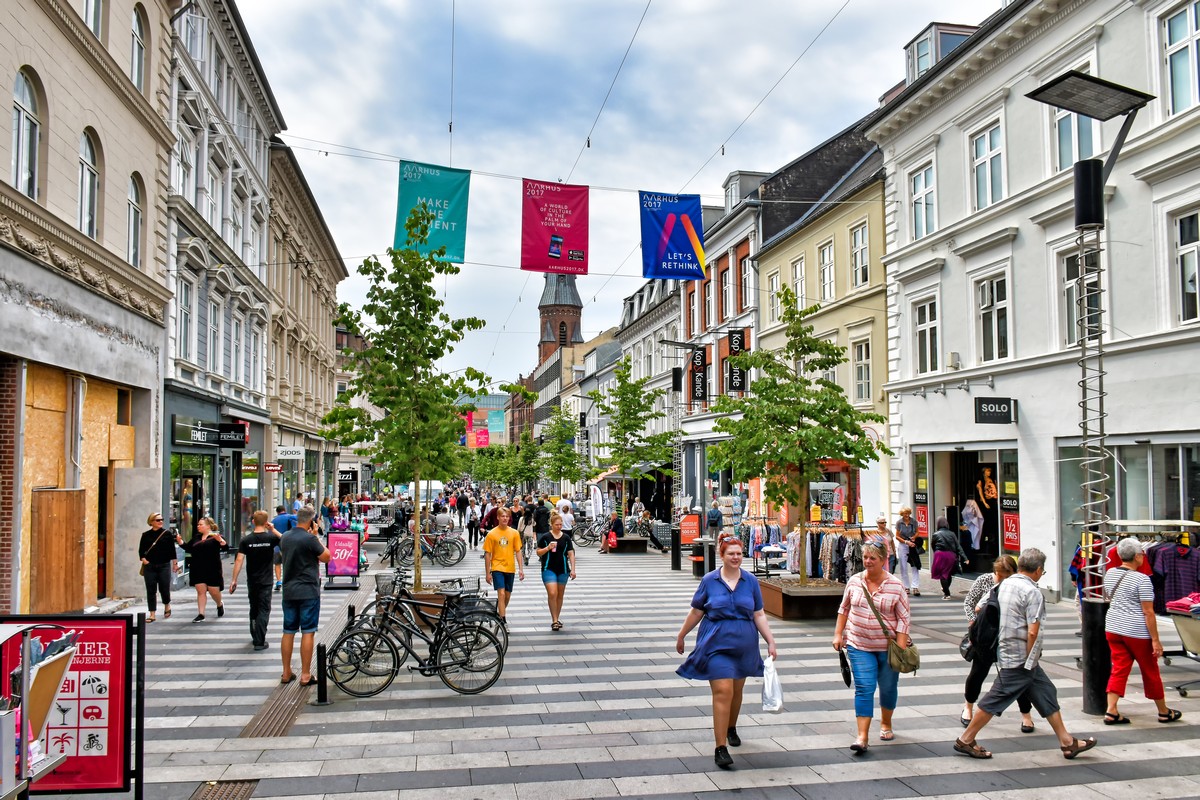 Kunden schlendern entlang der Einkaufsmeile Ryesgade im Zentrum der dänischen Stadt Aarhus. Die Ryesgade ist eine der belebtesten Einkaufsstraßen Dänemarks. Foto: Shutterstock.com