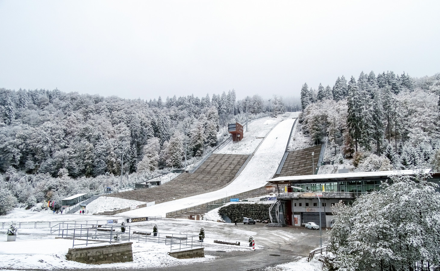 Wir verbrachten ein paar freie Tage im Herbst im schönen Touristenort Willingen im Sauerland. In der Umgebung gibt es einige lohnenswerte Ausflugsziele. Eines dieser Ziele ist die Weltcup-Skisprungschanze "Mühlenkopfschanze" im Ortsteil Stryck, vielen bekannt vom jährlich stattfindenden FIS Skisprung Weltcup. Die Sprungschanze der Kategorie K 130 ist die größte Großschanze der Welt. In der Nacht zuvor ist der erste Schnee der Wintersaison gefallen. Eine Skisprungschanze bei Schnee zu besichtigen ist natürlich ideal.